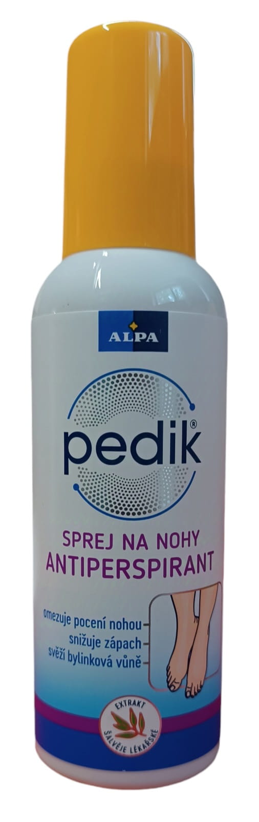 Szybkoschnący spray Alpa Pedik Antyperspirant do stóp przeznaczony do codziennej higieny stóp. Innowacyjna formuła z wyciągiem szałwii lekarskiej o skutecznym działaniu przeciwpotnym, w stężeniu zapewniającym długotrwałą ochronę przed nawracaniem kłopotliwego pocenia się nóg a zwłaszcza nieprzyjemnego zapachu potu na stopach, w butach i na skarpetkach.