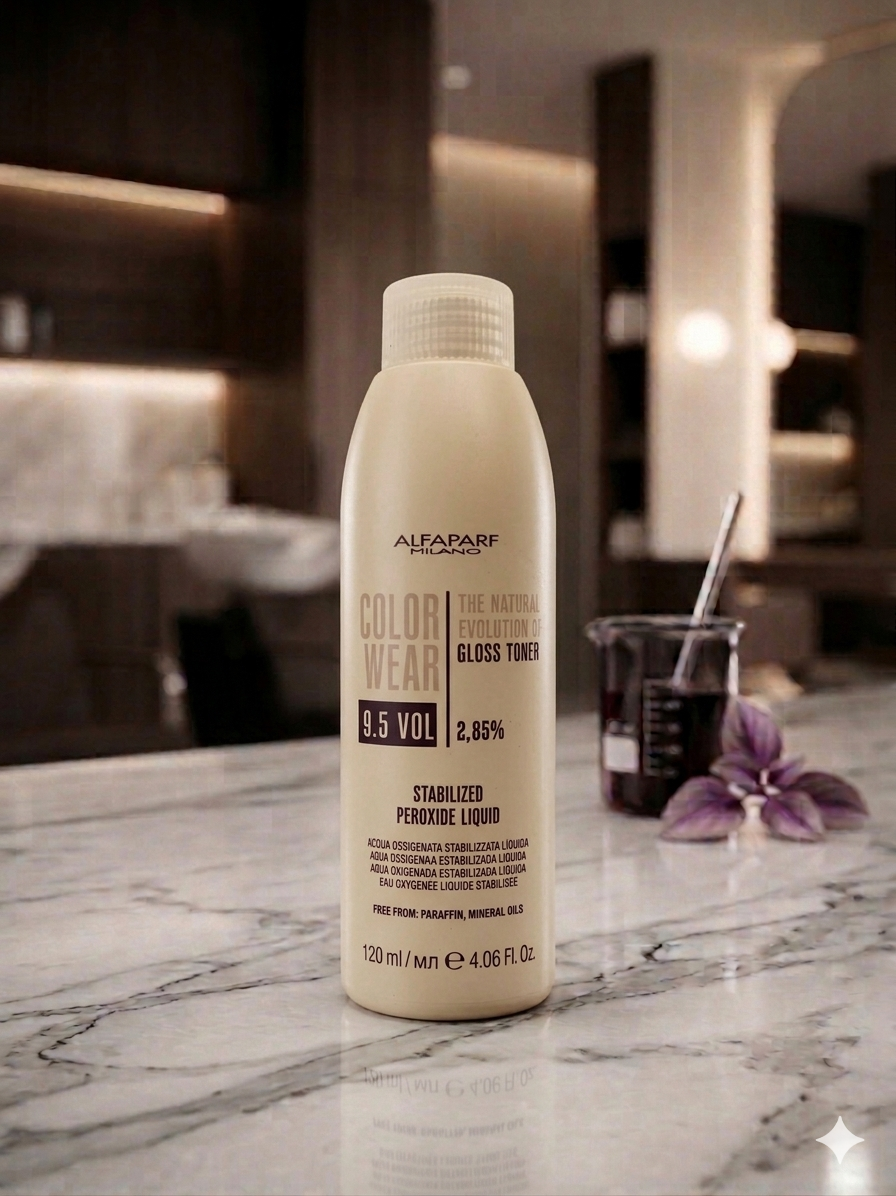 Alfaparf Color Wear Gloss Toner Peroxide Aktywator do tonerów 2,85% 120ml został stworzony specjalnie z myślą o koloryzacji z użyciem Color Wear Gloss Toner. Transparentna formuła aktywatora tworzy z tonerem delikatny żel, który jest łatwy do nałożenia oraz zmycia i nie spływa z włosów podczas koloryzacji, zapewniając wygodną aplikację i optymalne efekty.
