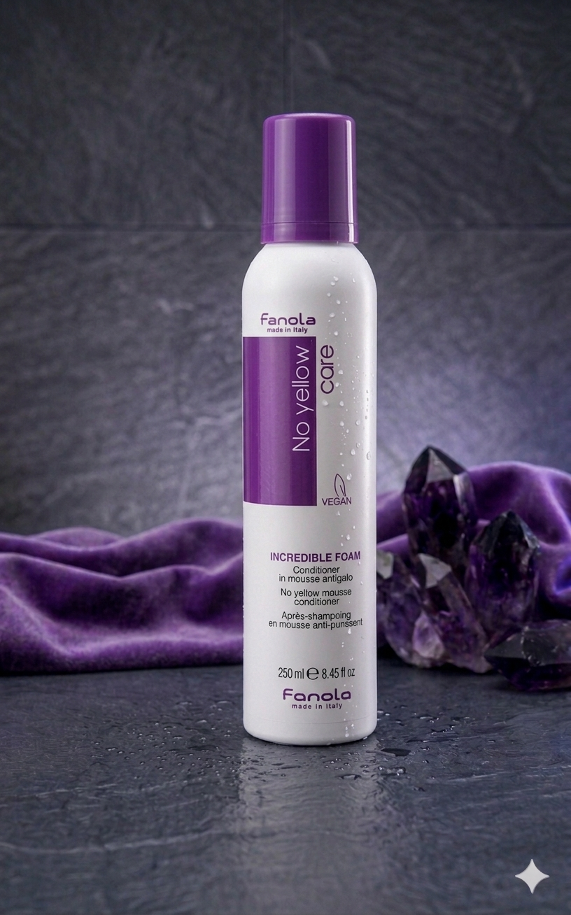Profesjonalna Odżywka w piance zawiera fioletowe pigmenty, które neutralizują niepożądane, ciepłe tony na włosach naturalnych, farbowanych i rozjaśnianych ochładzając odcień, jest mocniej na pigmentowana niż maska No Yellow,dzięki czemu ma silniejsze działanie tonujące. Dzięki lekkiej formule pianki odżywka jest bardzo łatwa w użyciu. Świetnie sprawdzi się do włosów cienkich,ponieważ nie obciąży ich.