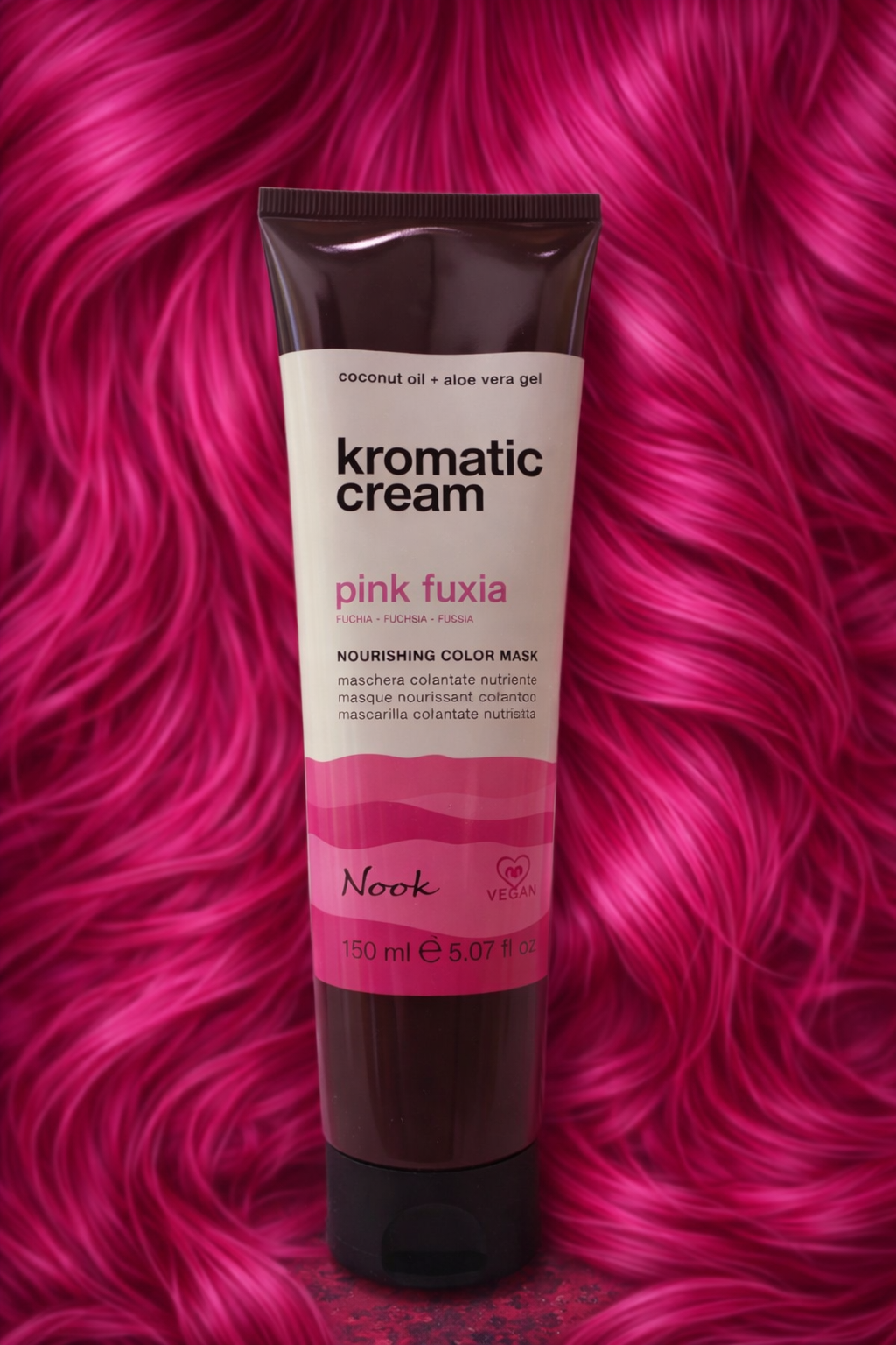 Nook Kromatic Cream PINK FUXIA to odżywcza maska do włosów z bezpośrednimi pigmentami i kwaśną wartością pH, która nadaje włosom tymczasowe, odświeżenie koloru - bez silikonów i agresywnych składników. Odcień PINK FUXIA zapewnia jasny, mocny modny róż.