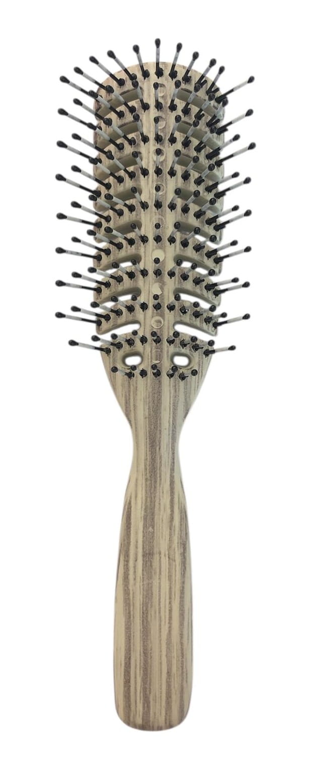 Szczotka do włosów z efektem drewna to stylowe i funkcjonalne narzędzie do codziennej pielęgnacji. Jej ergonomiczny kształt zapewnia wygodny chwyt, a szeroko rozstawione, elastyczne ząbki zakończone kulkami delikatnie masują skórę głowy, jednocześnie skutecznie rozczesując włosy bez ich łamania. Otwarta konstrukcja korpusu wspomaga cyrkulację powietrza, co sprawia, że szczotka idealnie nadaje się do użytku podczas suszenia włosów. Lekka, trwała i uniwersalna – odpowiednia do każdego rodzaju włosów.